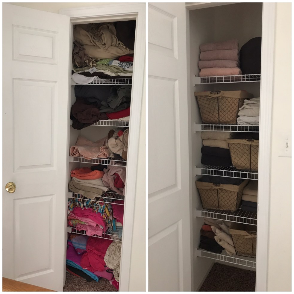 This was super easy to do … with my husband’s help, we first cleaned out the closet. Decided what we use on a daily/weekly basis vs. what we will be donating. We then put all the extra blankets in another closet.